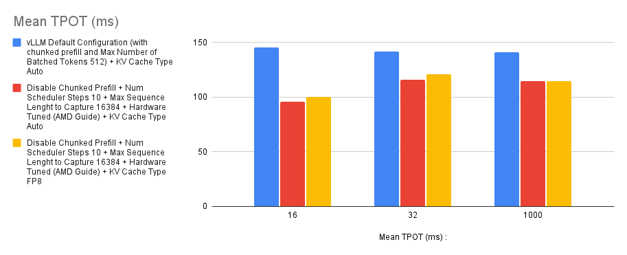 Based on the experiment we ran, we found that there’s a slight improvement with tuning the chunked prefill values over disabling the chunked prefill feature. However, if you’re not sure whether to enable chunked prefill or not, simply start off by disabling it and you should generally expect better performance than with using the default settings. This is specific to MI300X GPUs.